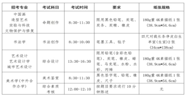 中国画、书法学、造型艺术、实验与科技、文物保护与修复、艺术设计、艺术设计学、城市艺术设计专业考试分为线上考试和现场考试。线上考试评定成绩仅分为合格或不合格。线上考试成绩合格的考生方可参加现场考试。