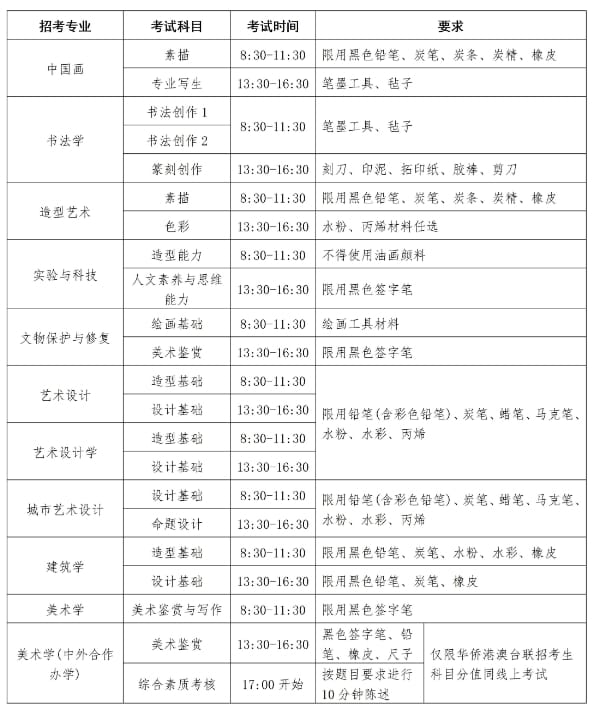 中国画、书法学、造型艺术、实验与科技、文物保护与修复、艺术设计、城市艺术设计、建筑学专业面向香港中学文凭考试学生招收本科生。